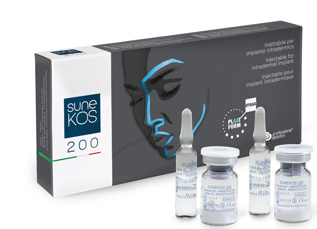 SuneKos ist ein injizierbarer Biostimulator, der auf einer patentierten Mischung aus unvernetzter Hyaluronsäure und einer spezifischen Sequenz von sechs Aminosäuren (HY6AA-Formel) basiert.